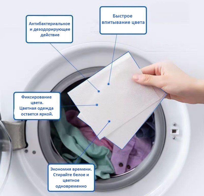 Салфетки для стирки используют для предотвращения окрашивания при совместной стирке белого, черного и цветного белья. Теперь нет необходимости сортировать белье перед стиркой, всю одежду и вещи можно стирать вместе с цветным. Сетчатая структура салфеток эффективно и быстро улавливает цветные частицы линяющей одежды, они притягиваются к ним как магнит, что позволяет сохранить цвет и насыщенность вещей различных оттенков и цветов.